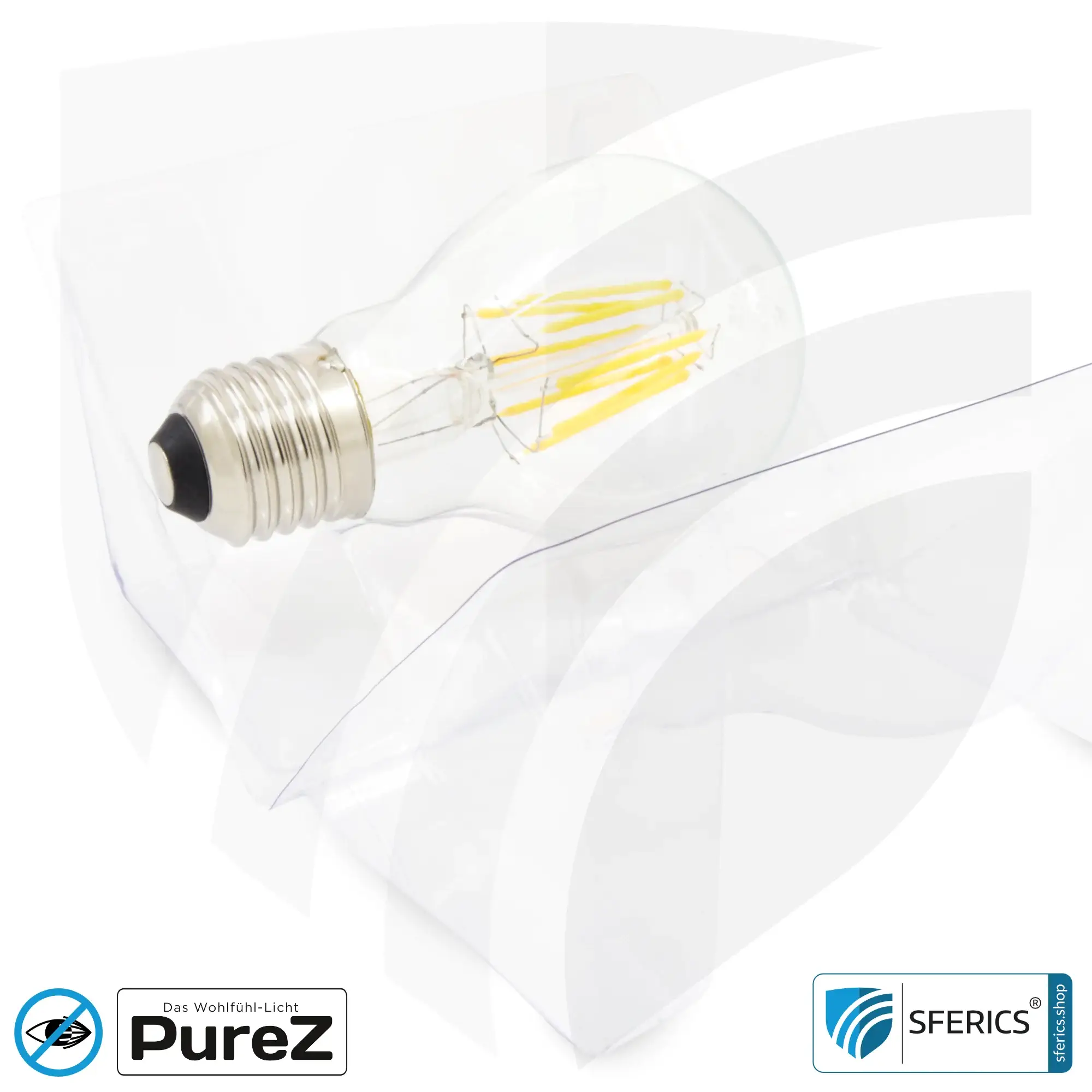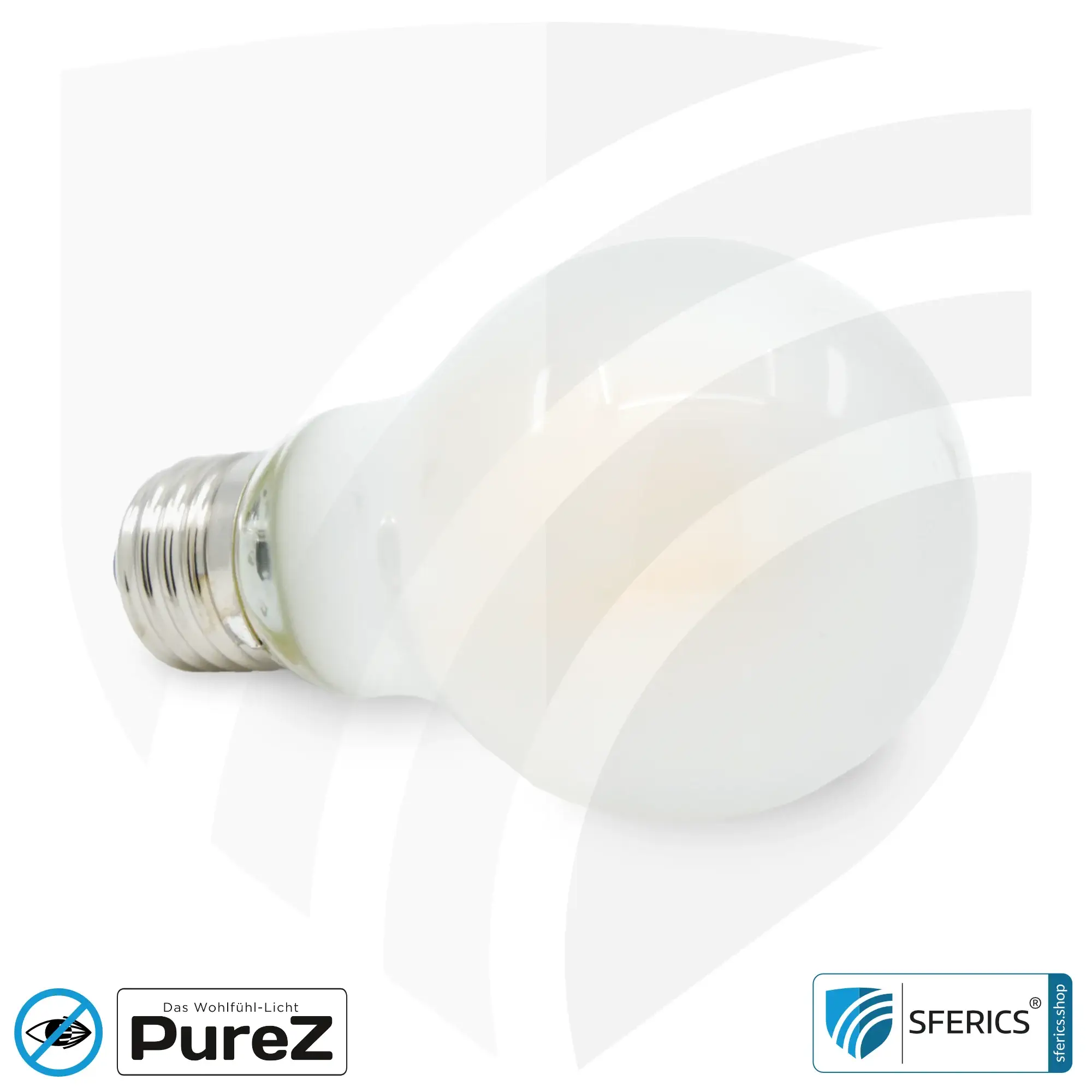 6,4 watt LED Filament Pure-Z NEO with E27 socket. A natural feel-good BIO LIGHT with an incredible CRI 97 color rendering and almost “flicker-free”. Available in clear glass and frosted glass. Not dimmable.