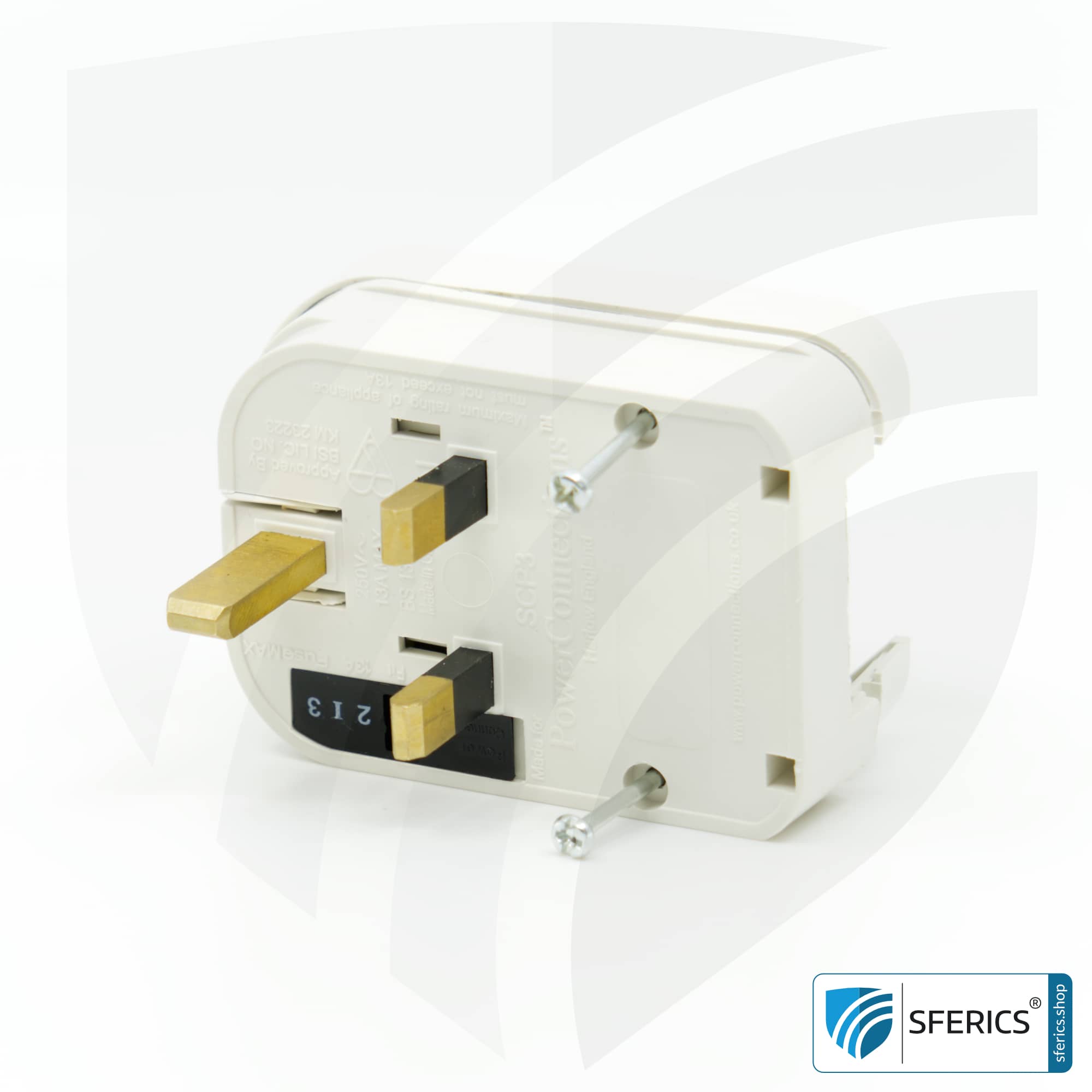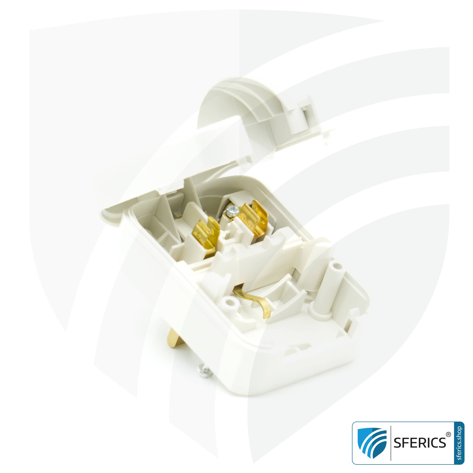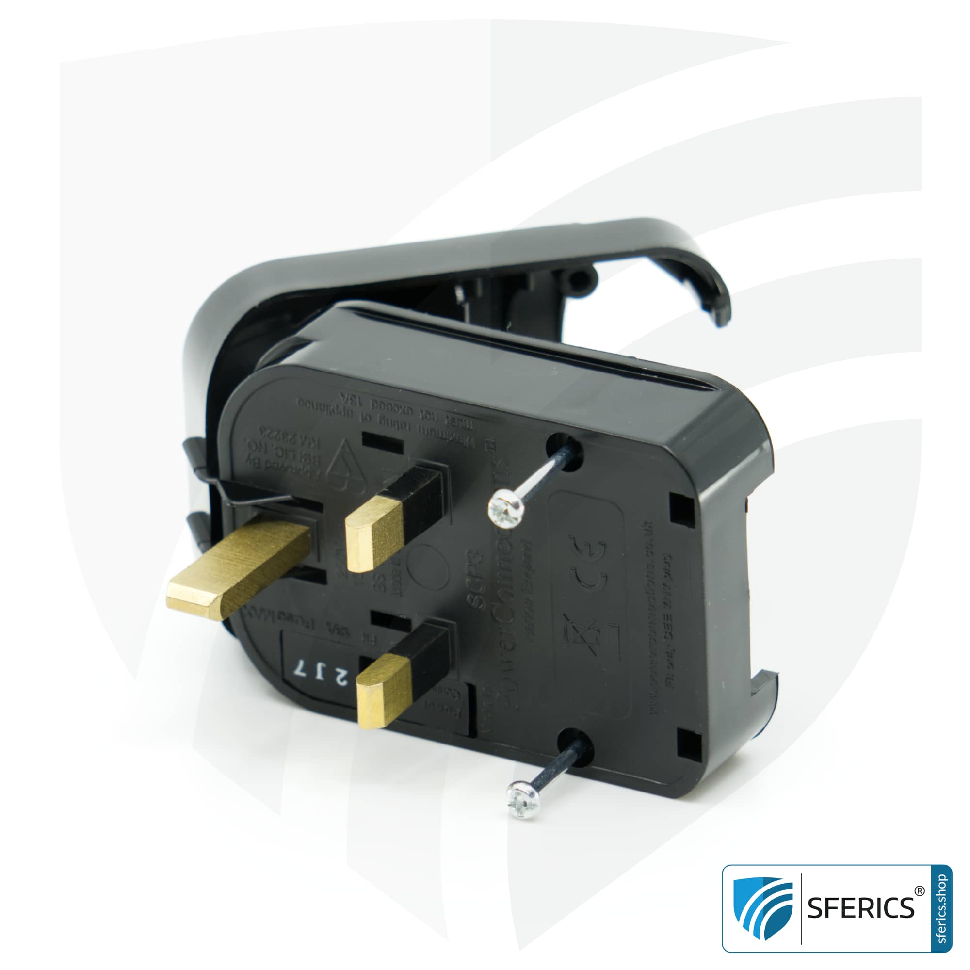 This adapter with grounding connection converts the european Schuko plug to a 3-pin British mains plug. For safety reasons, the adapter is equipped with a 13 amp fuse, which can be replaced quickly and easily in a few steps.