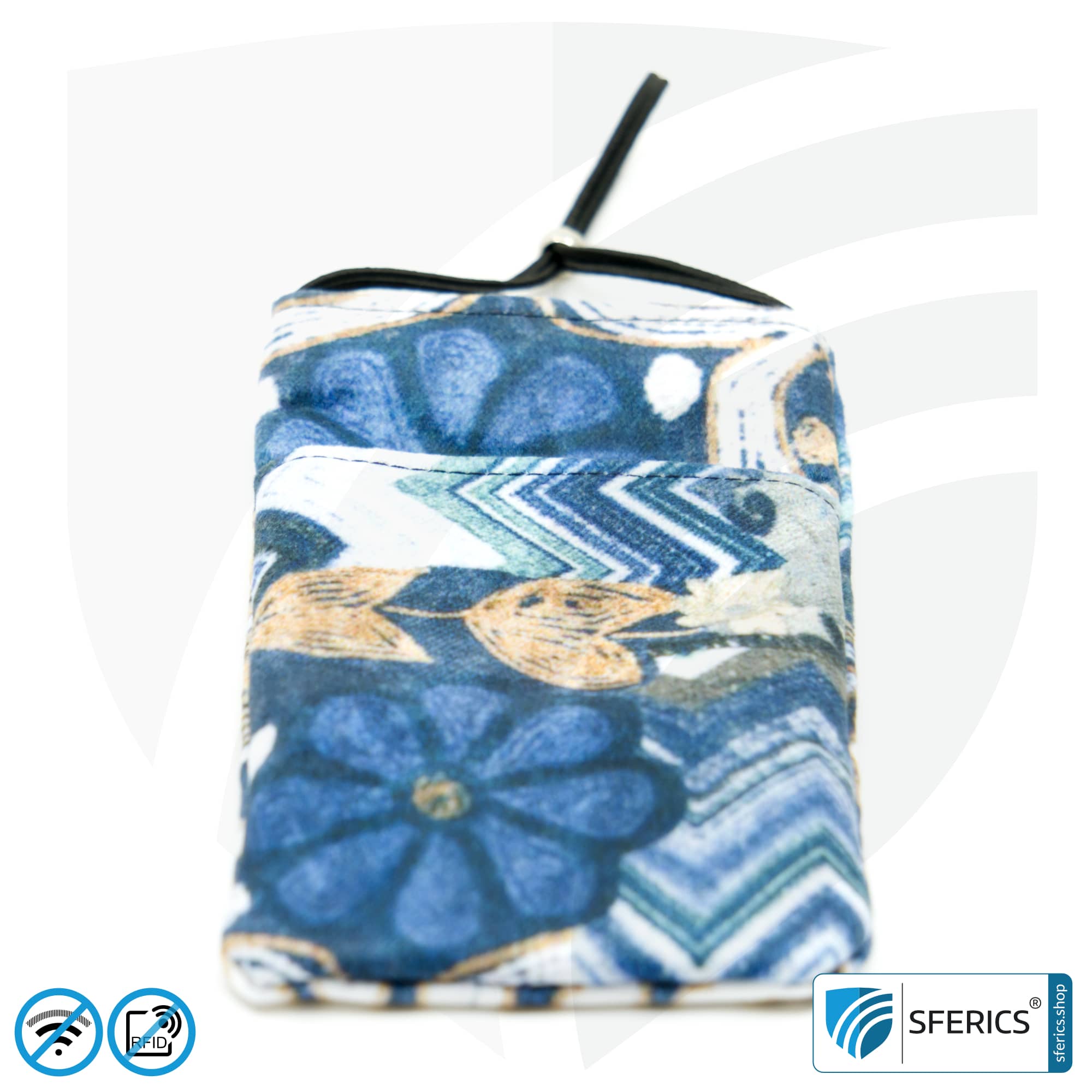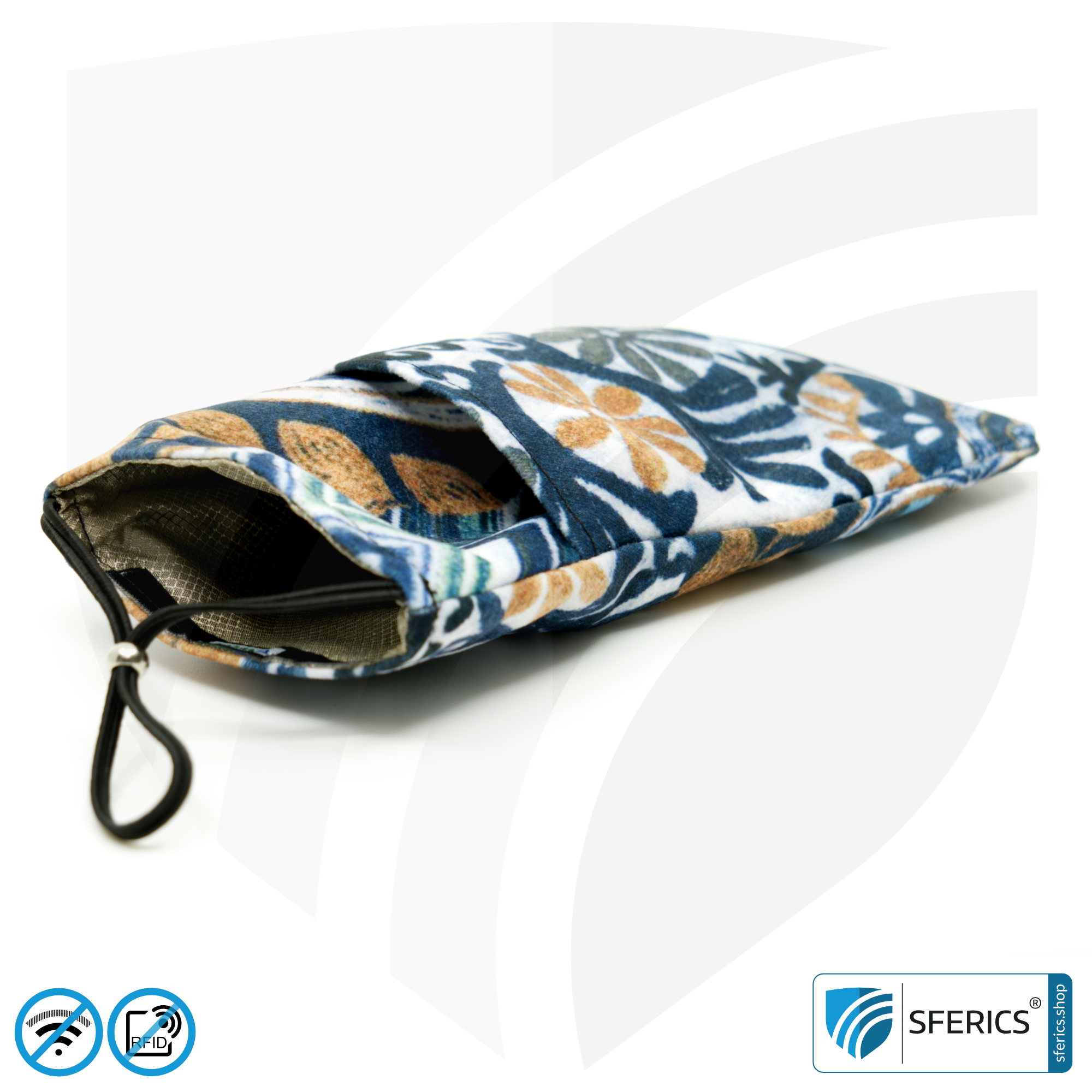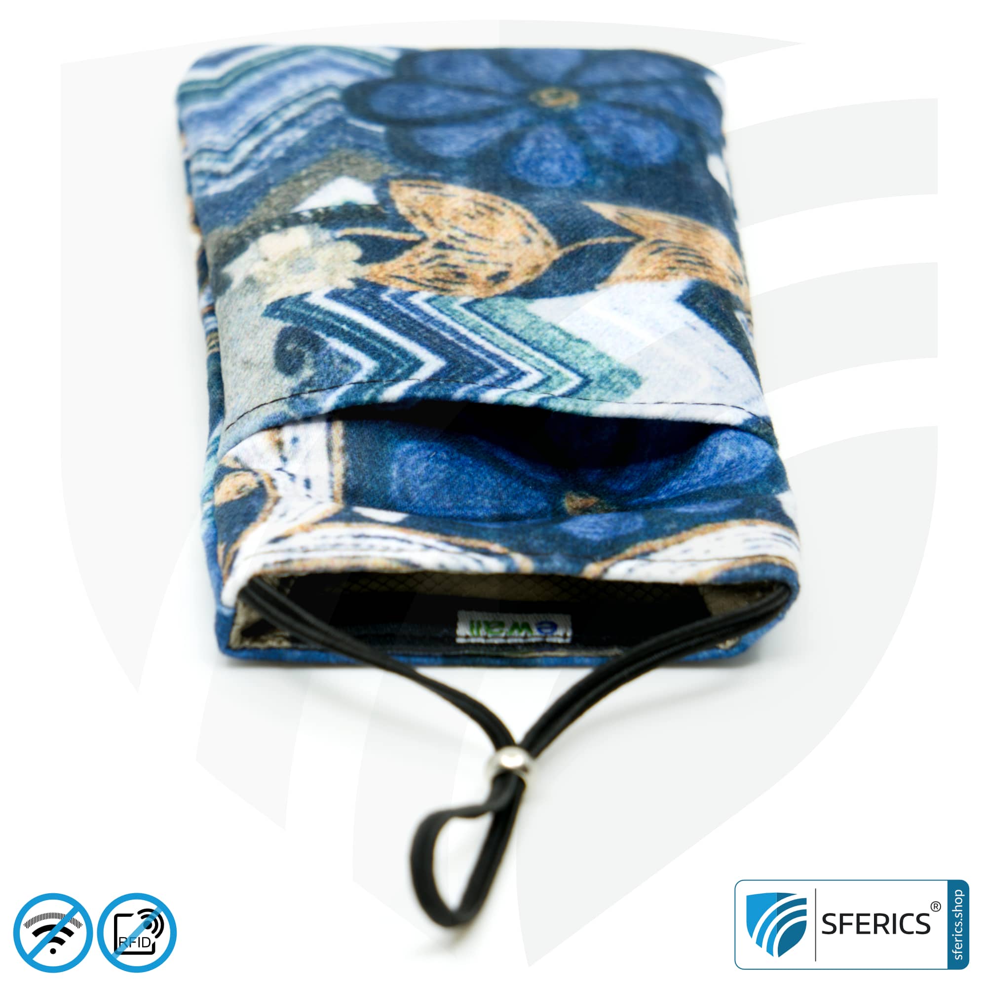 The eWall mobile phone pouch FELIX.BLUE design with radiation protection. Shielding with over 95% efficiency against HF electrosmog from your own smartphone. 3in1 protection including radiation protection, data protection, protection against damage.