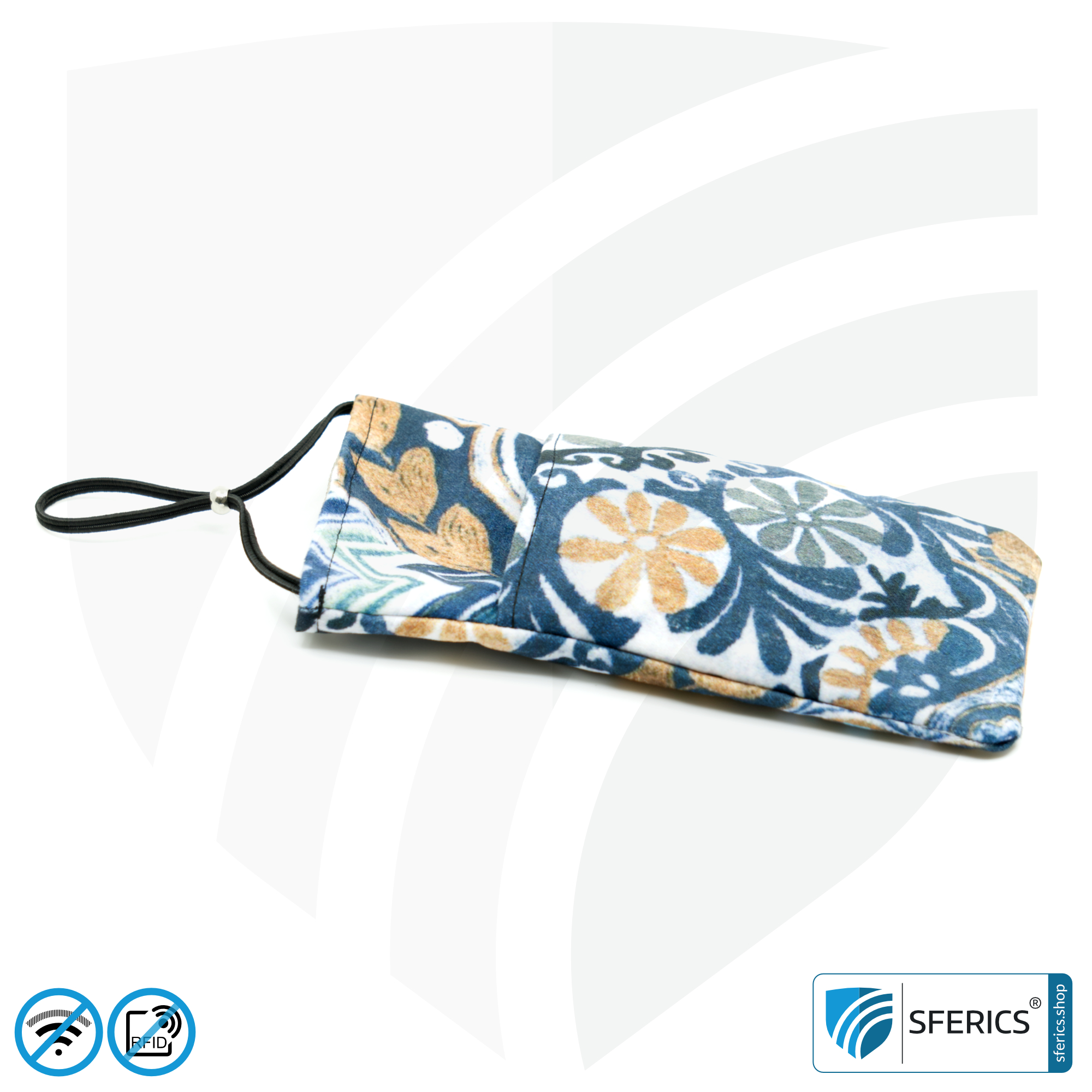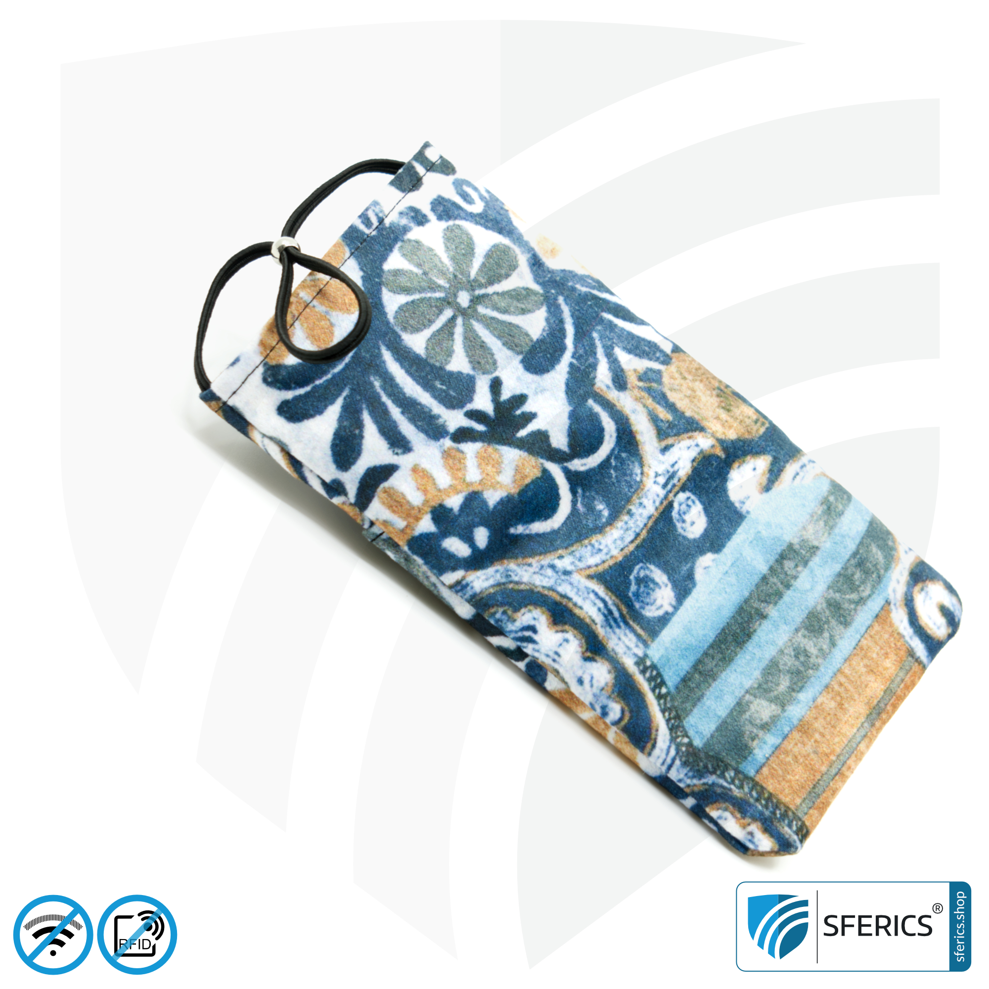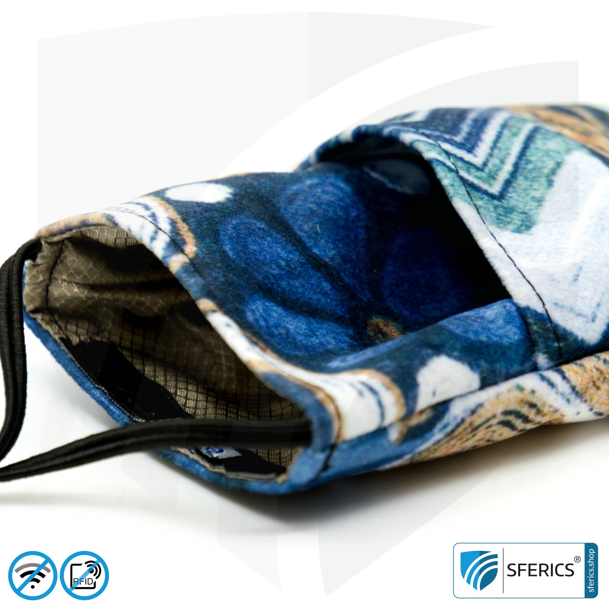The eWall mobile phone pouch FELIX.BLUE design with radiation protection. Shielding with over 95% efficiency against HF electrosmog from your own smartphone. 3in1 protection including radiation protection, data protection, protection against damage.