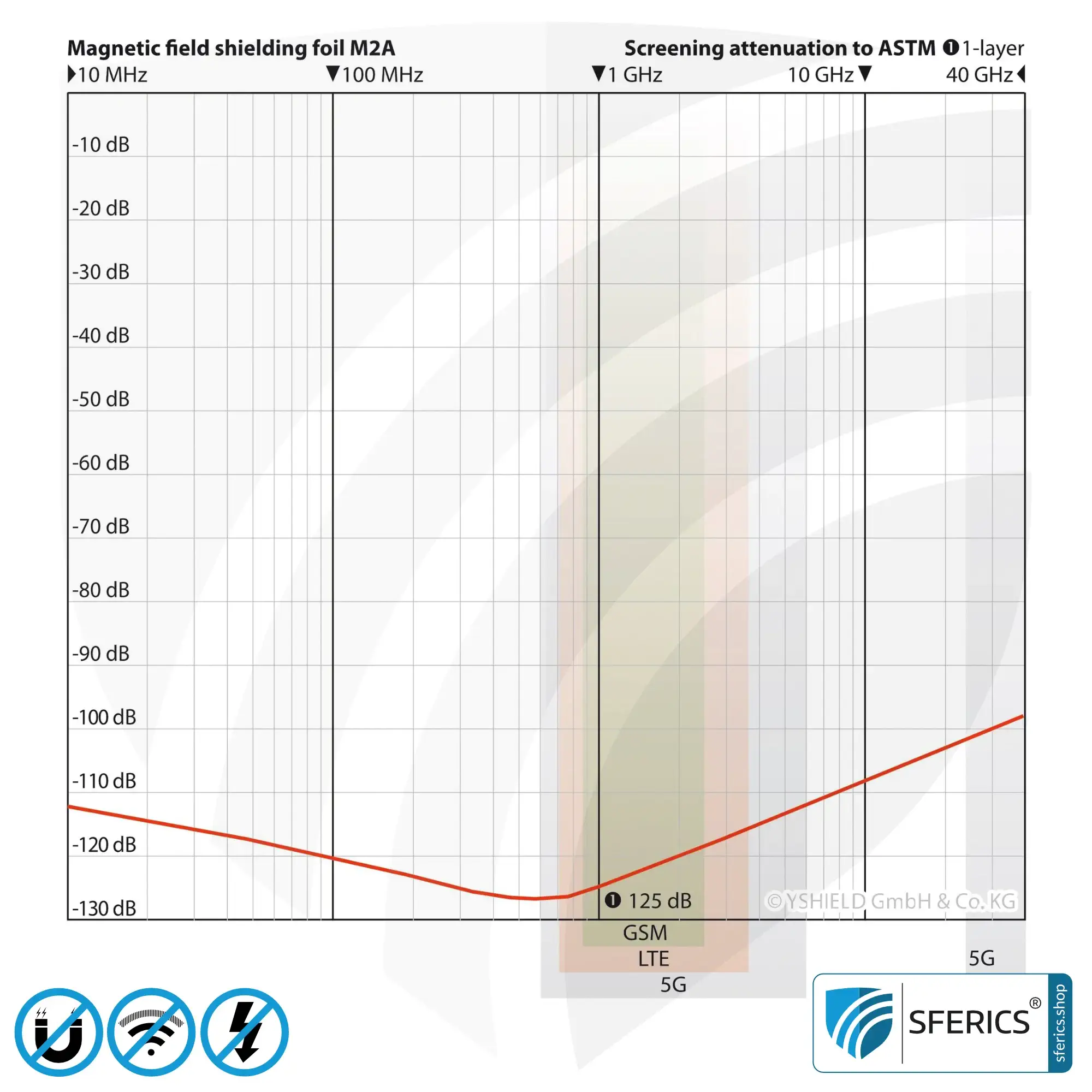 M2A is our new magnetic field shielding foil and a broadband all-rounder against electrosmog. In addition to its high shielding attenuation performance against magnetic fields (12 dB with just one layer!), M2A, thanks to its aluminum surface, also provides excellent shielding against HF radiation (up to 125 dB!) and is therefore groundable.