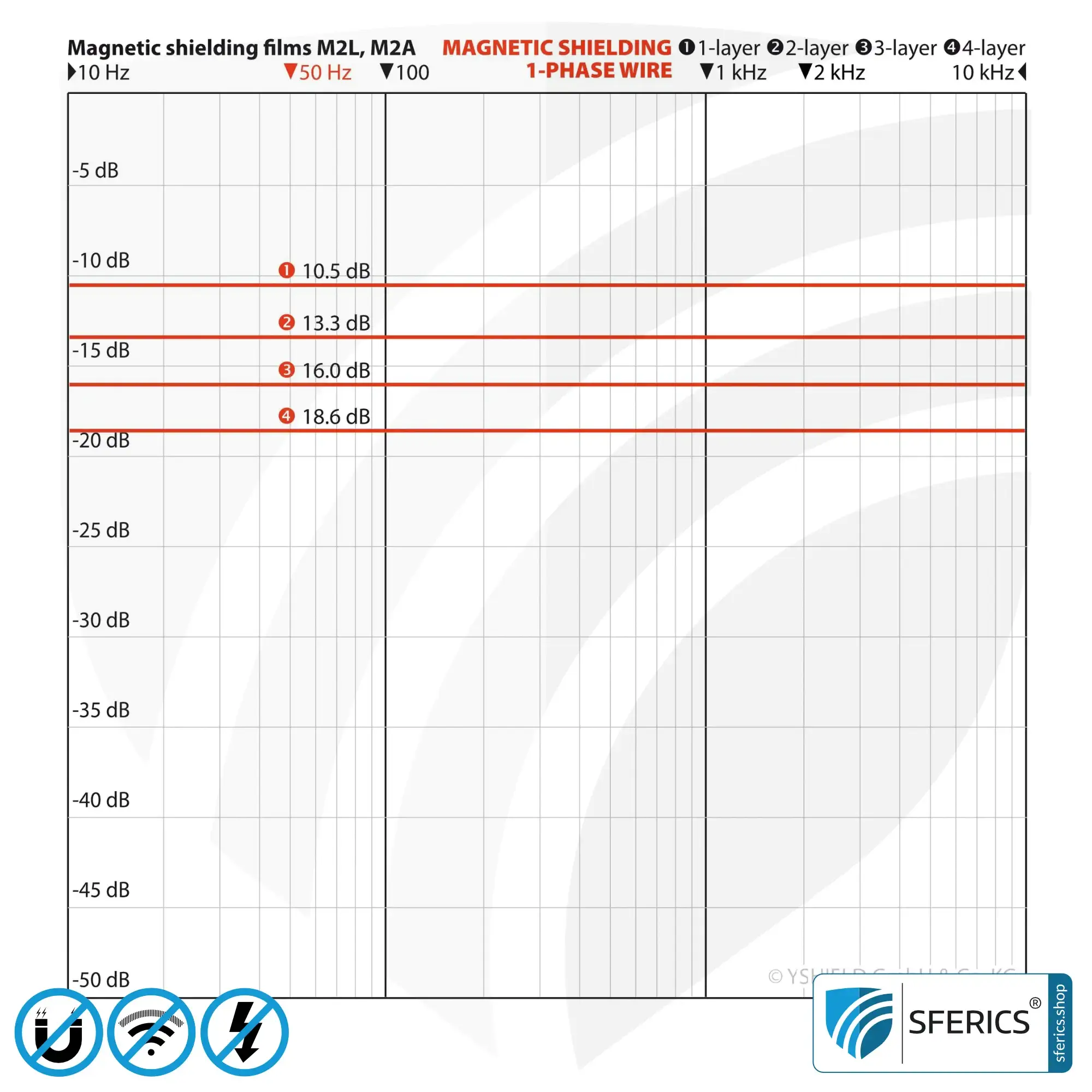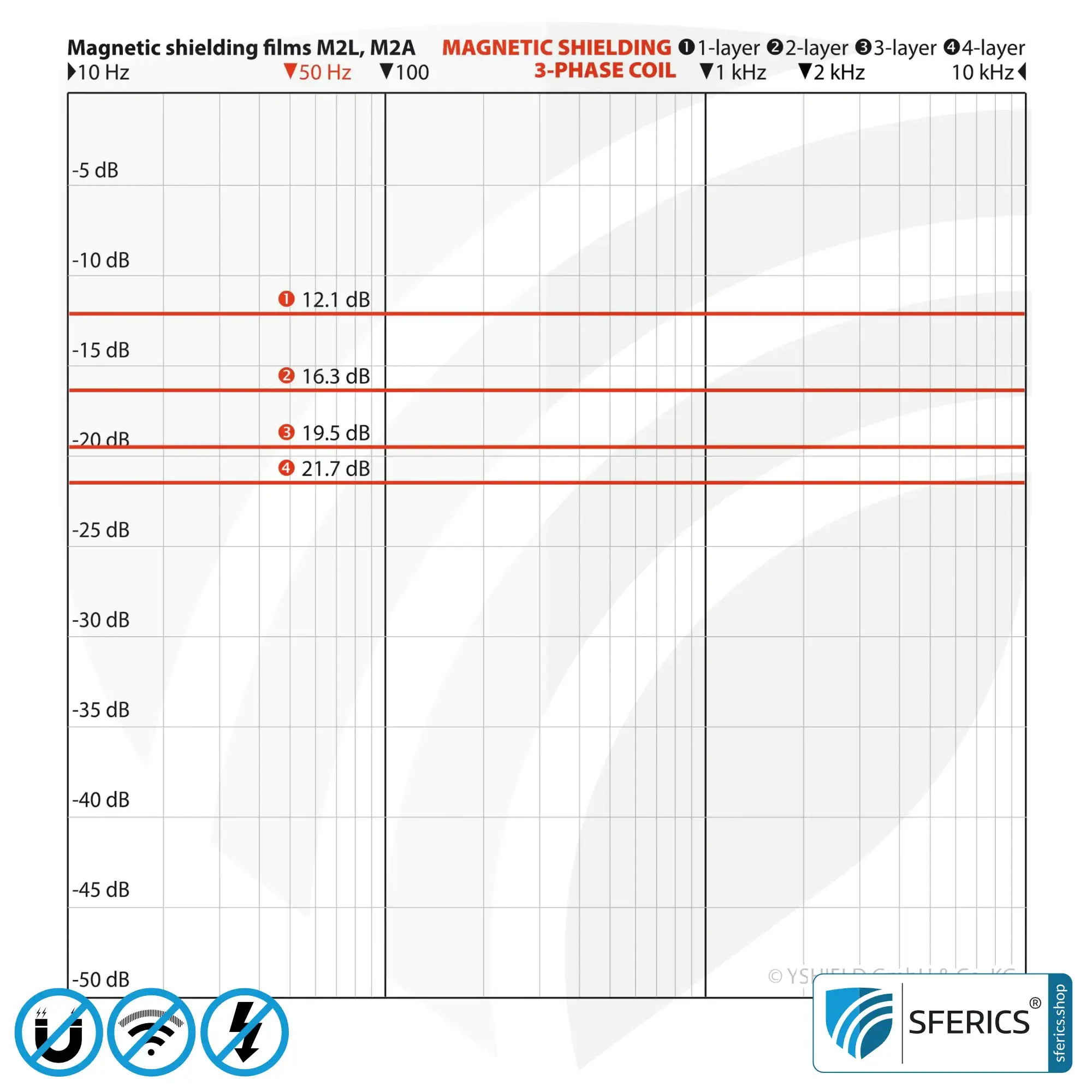 The same applies to the M2A magnetic field shielding foil. For relevant shielding of static magnetic fields—such as those from DC consumers, permanent magnets, or the Earth’s magnetic field—multiple layers of shielding foil are necessary. Conclusion: Without a suitable magnetic field measuring device for continuous monitoring during processing, effective shielding of static magnetic fields is not feasible.