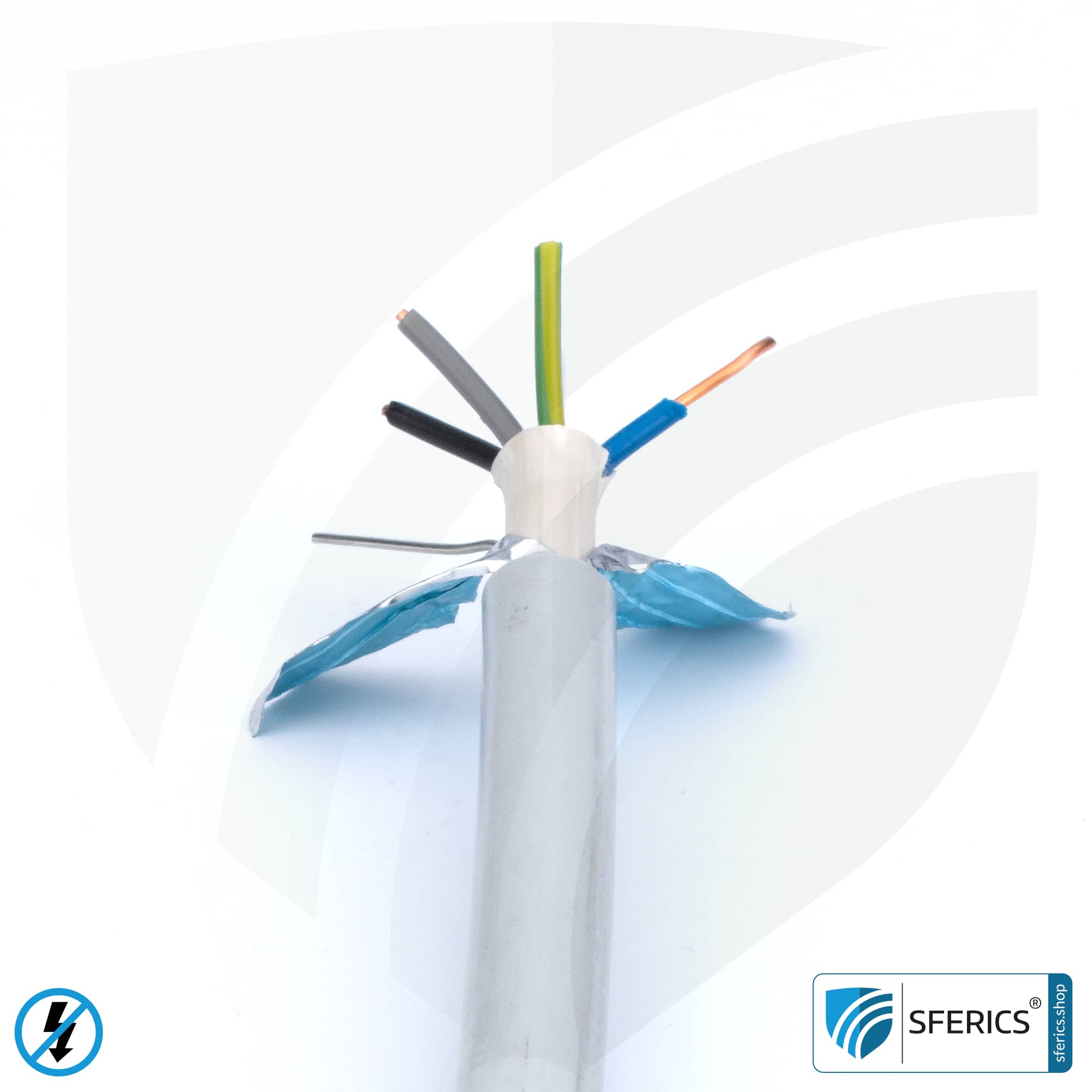 This high-quality shielded cable enables effective shielding of low-frequency electrical fields. In contrast to the shielded PVC cable, this variant (N)HXMH(St)-J of a sheathed cable is also halogen-free (i.e. in the event of fire no corrosive / narcotic gases are produced. The smoke development remains low) and plasticiser-free. Furthermore, an improved behaviour in case of fire has been integrated. Consider that a standard electrical cable, laid during the construction of the flat or house, produces a strong electrical alternating field which reaches up to 2 meters into the room. And since the power lines in the floor, ceiling or wall are continuously under current with 16 amps and 220 volts, this LF electrosmog issue is a 24/7 topic – 24 hours and 7 days a week.
