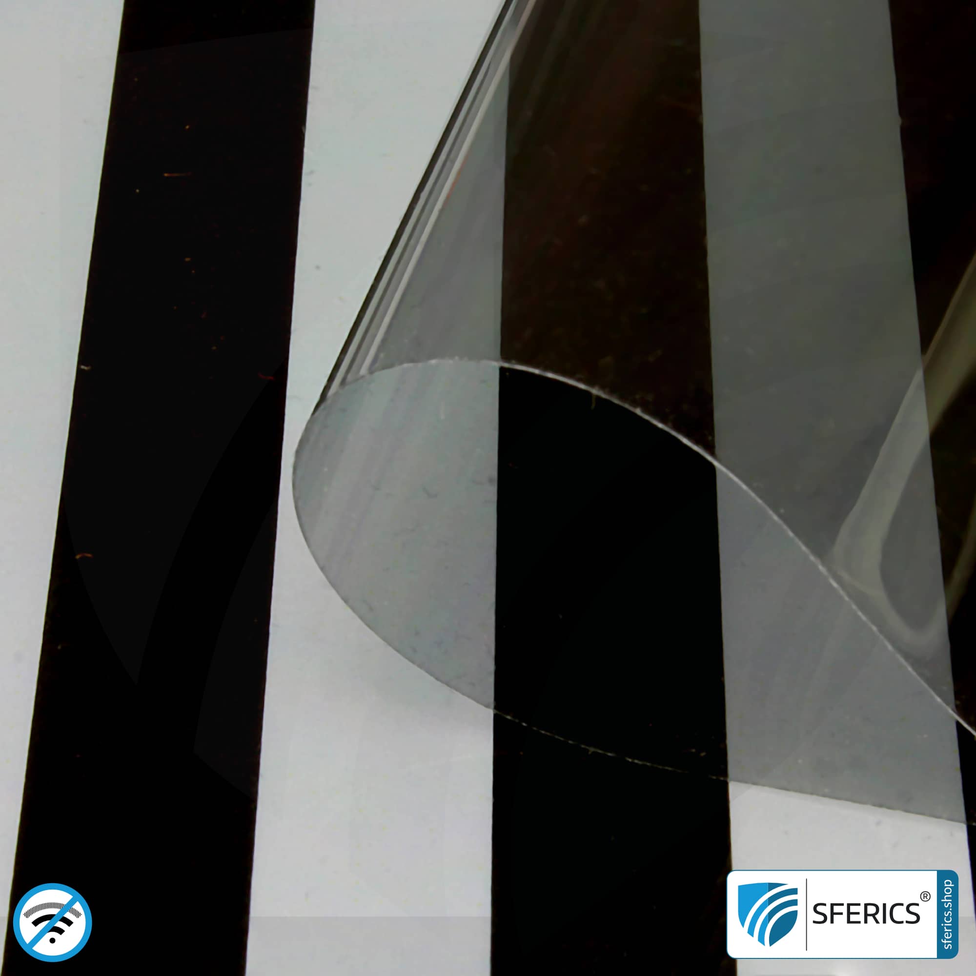 This self-adhesive RDF62 special film is coated in precious metal and suited for protecting from high-frequency electromagnetic radiation caused by mobile radiation from transmitters, mobile phones, smartphones, WLAN, etc. It is typically stuck on the inside of windows without glazing.