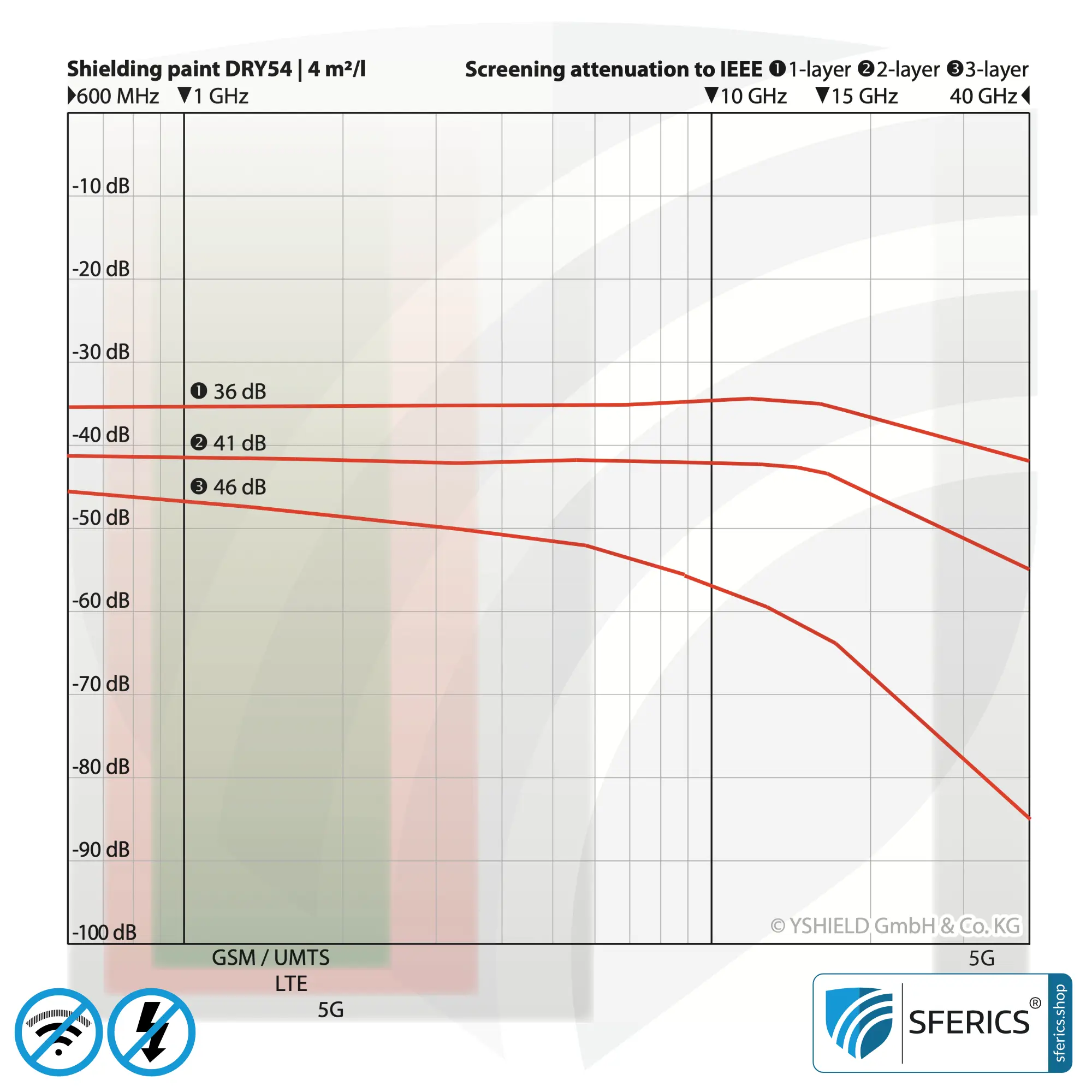 The special shielding paint DRY54 from YSHIELD is ideally suited for the effective shielding of exposure to electrosmog from radio radiation and alternating electric fields. Radio pollution from mobile phones, mobile internet, WLAN, DECT, GSM, LTE, 5G, etc. is shielded by up to 75 dB, which corresponds to an effectiveness of over 99.99999%. Electric fields from domestic electricity (alternating current) are grounded extremely effectively and can be completely shielded up to 100%.